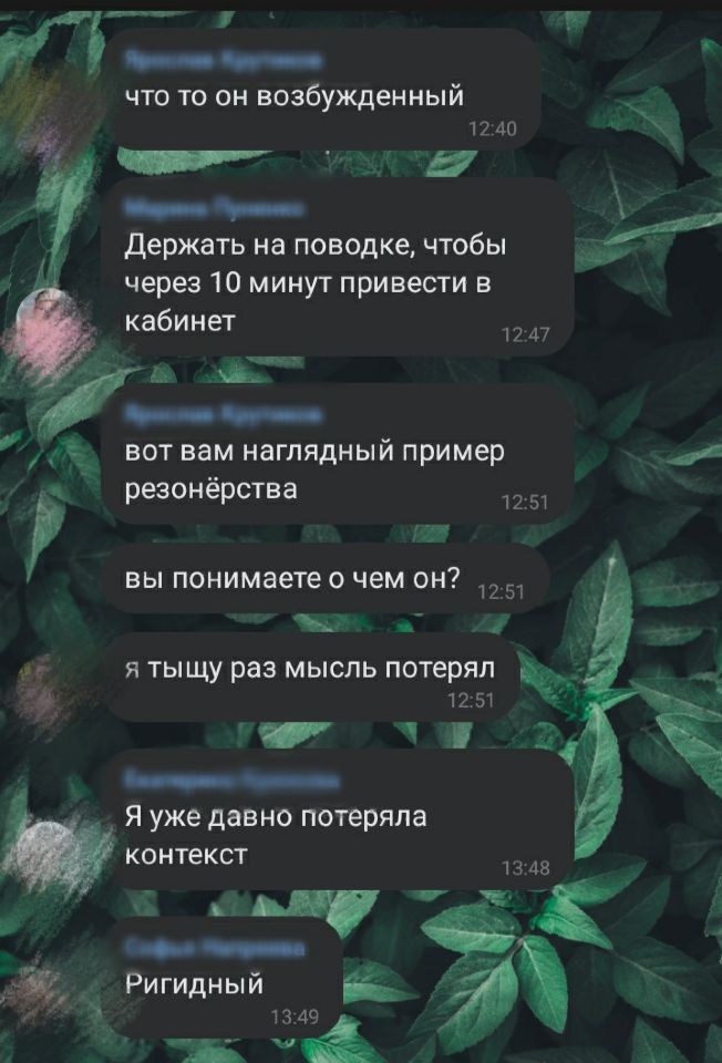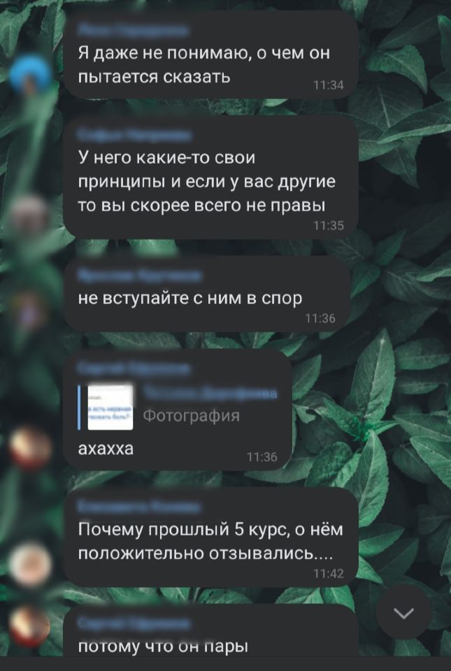 Отрицает психоанализ в принципе как направление. Мне противно описывать то, что он говорит о психоаналитиках. Поэтому делать этого не буду. К нему "разумеется, ходят только девушки..., ведь он мужчина". Нарциссизм просто ликует и рукоплещет. К занятиям всегда не готов. Вроде приносит какие-то бумажки, но к ним даже не прикасается, говорит на какие-то отвлеченные темы, интересные только ему. Группа занимается своими делами, так как стараться разобраться в хитросплетениях его нецеленаправленного мышления весьма затруднительно. Нет, у него нет психических расстройств, но понять его действительно сложно, и не только мне, - всей группе. Он оспаривает суждения всех учащихся. Я однажды повысила голос на него, он меня довел. А меня сложно вывести из себя. Он давил на меня, хотя я четко дала понять, что не хочу отвечать на его провокации. Он раз за разом поворачивался ко мне, и требовал, чтобы я поговорила с ним.