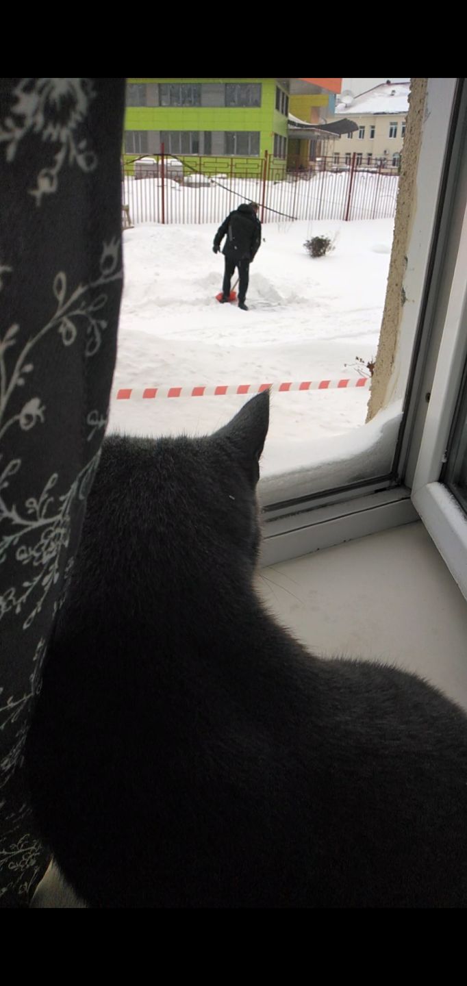 На самом деле, у него очень истеричная жена. Он каждые 30 минут выходит курить, и когда докурит, то ещё минут 40 смотрит куда-то вдаль, или звонит другому соседу и они долго разговаривают. Сейчас он медитирует убирая снег.