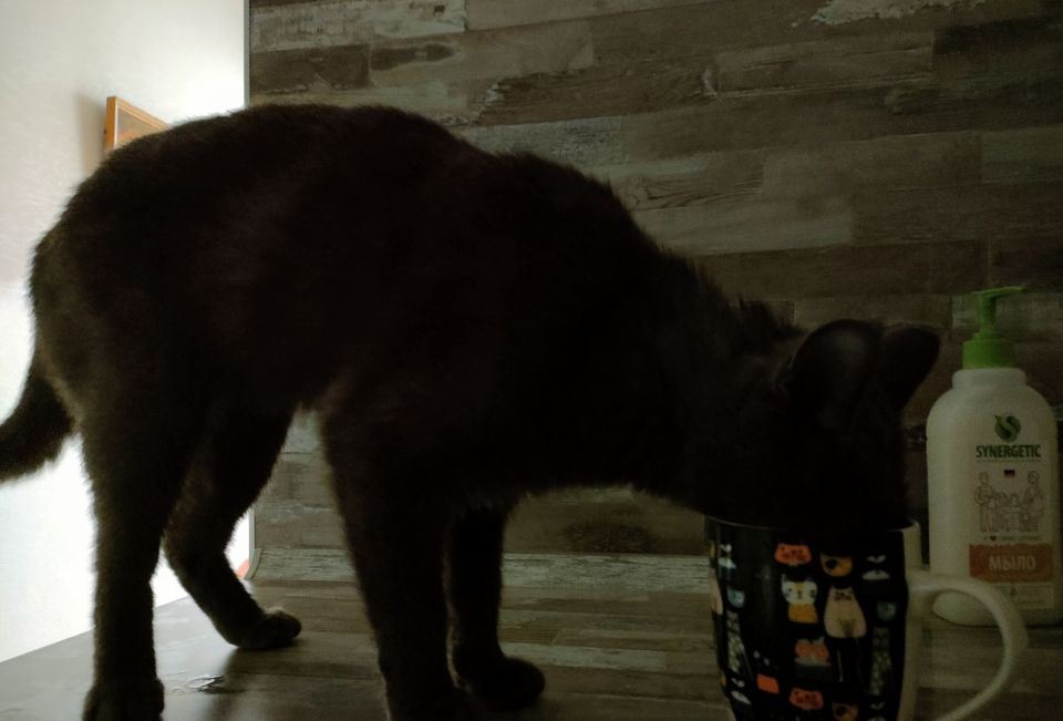 Человеко-кот. Не любит пить из своей чашки. Ворует у меня. Вроде и выпросил воды из под крана попить, но святой долг попробовать, а не вкуснее ли вода у Тани.