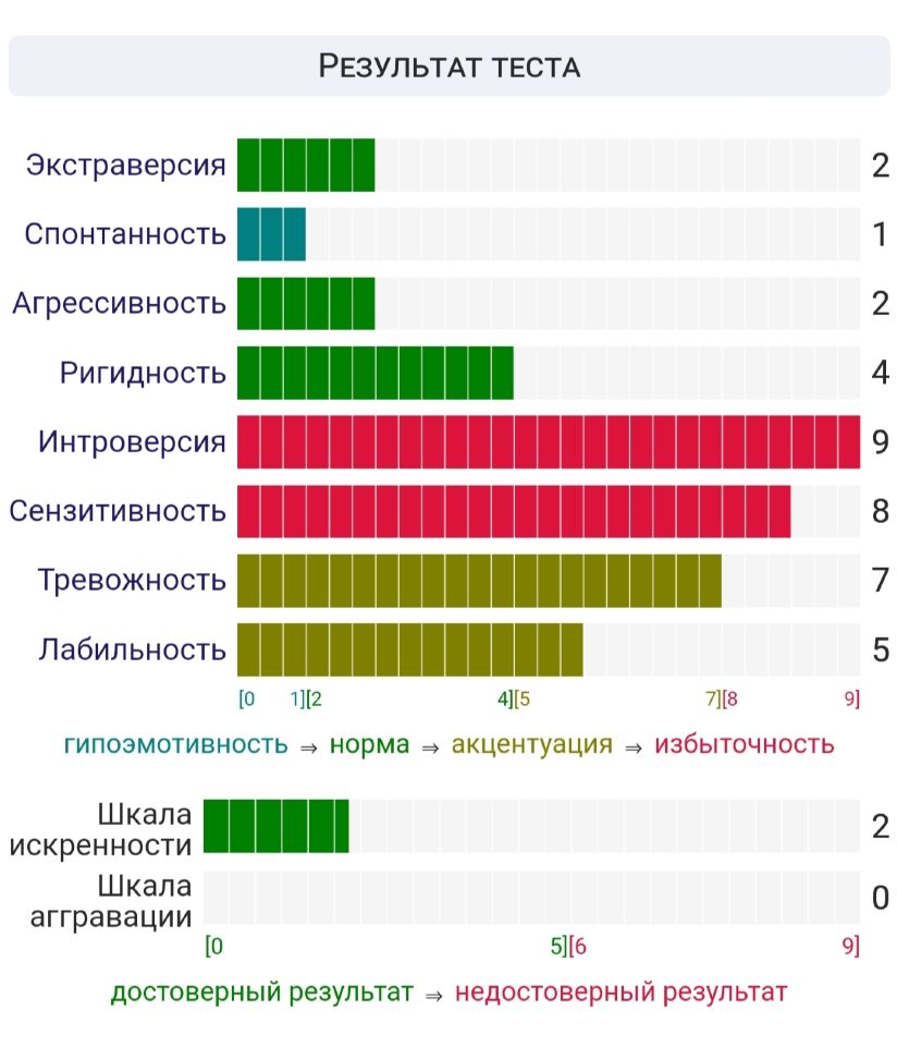 hanna_lightman 34 слова 19.07.2022 СМИЛ не выявил патологий...вау. Что-то новенькое, обычно шизоидность и депрессия всегда была высокой. А зато ИТО показал мне зоны роста. Работать над своей сензитивностью, работать и ещё раз работать. 0