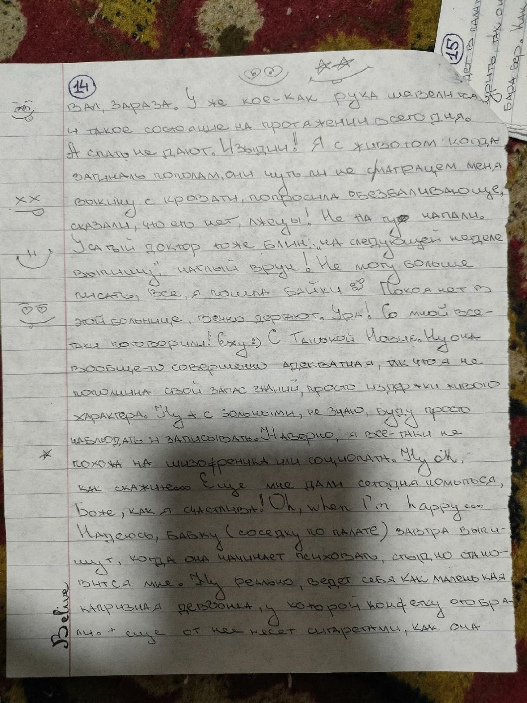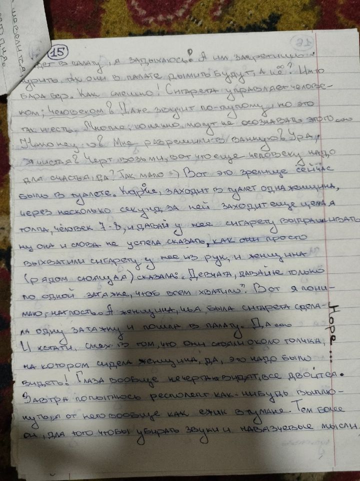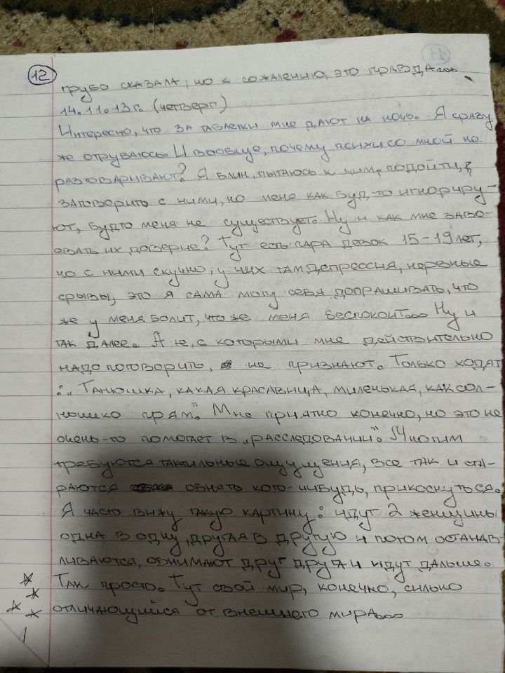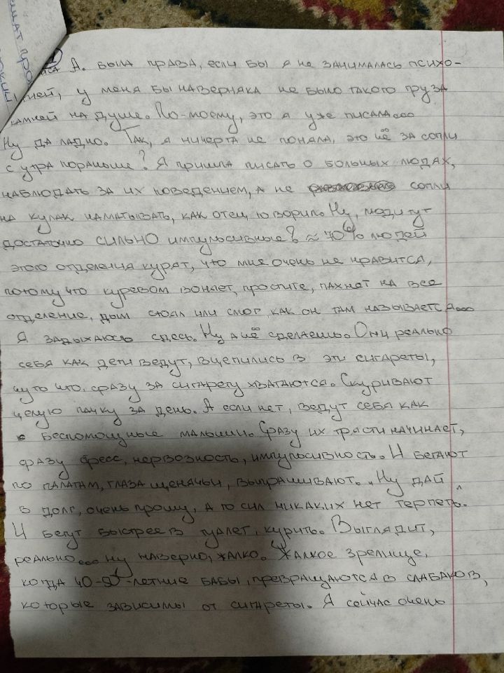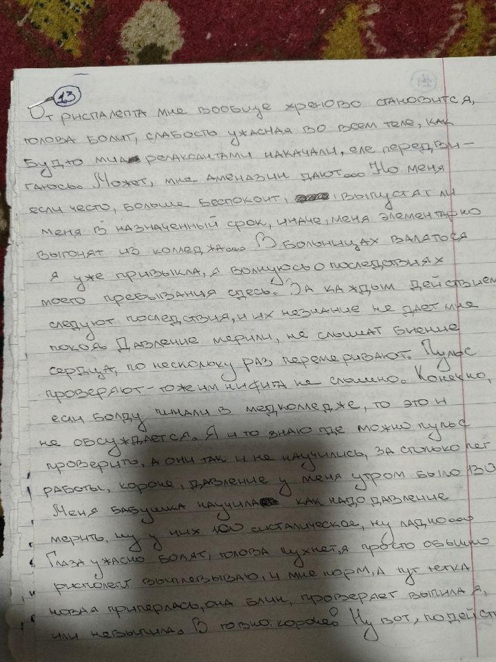 Я действительно делала много орфографических и смысловых ошибок. Под риспередоном было ужасно сложно что-либо писать и соображать. В глазах двоилось, тремор, слабость. Я едва могла разобрать, какую букву я пишу. Вела линии наугад. Мне давали циклодол, я его то отменяла, то вновь принимала. Смотрела его эффект на себе. Помню, что было одинаково плохо и с ним и без него. Разницы не заметила.