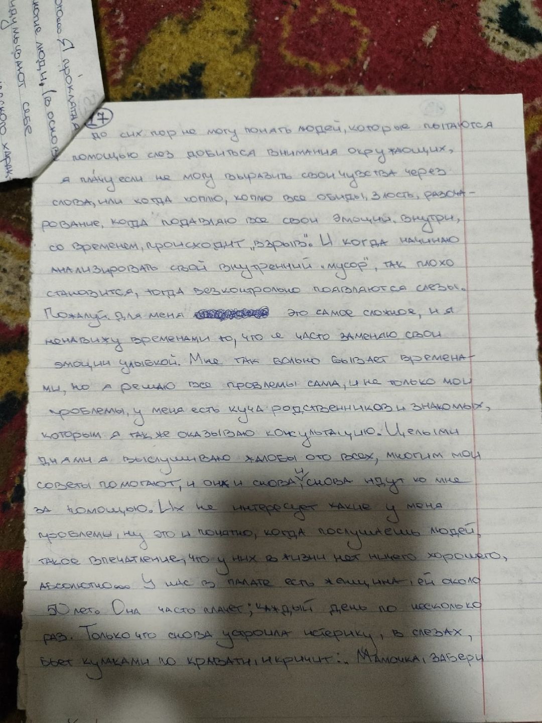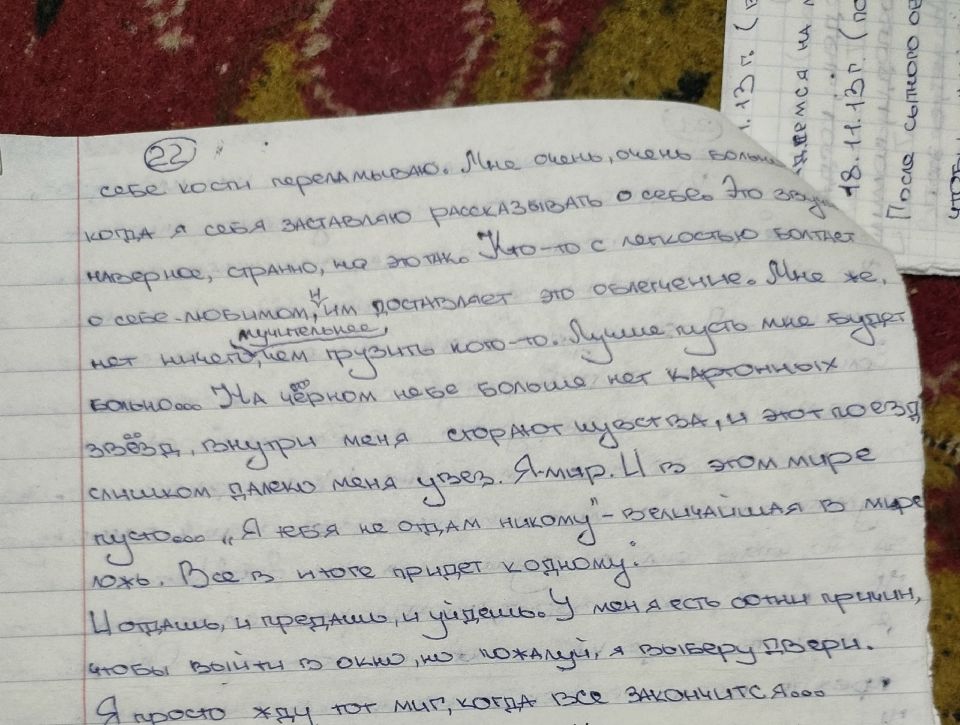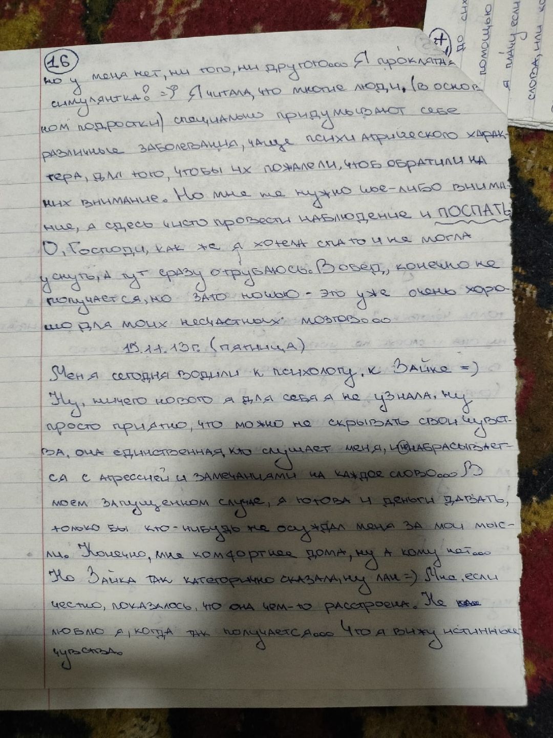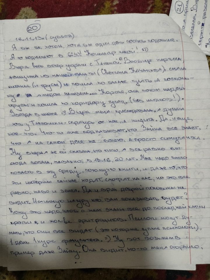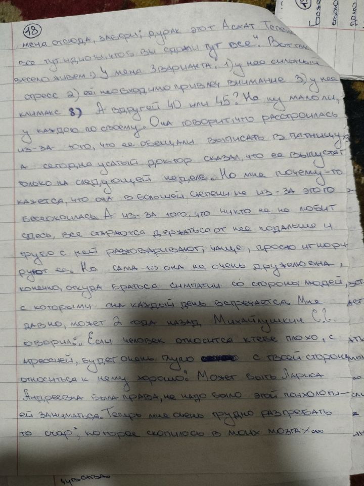 Я действительно делала много орфографических и смысловых ошибок. Под риспередоном было ужасно сложно что-либо писать и соображать. В глазах двоилось, тремор, слабость. Я едва могла разобрать, какую букву я пишу. Вела линии наугад. Мне давали циклодол, я его то отменяла, то вновь принимала. Смотрела его эффект на себе. Помню, что было одинаково плохо и с ним и без него. Разницы не заметила.