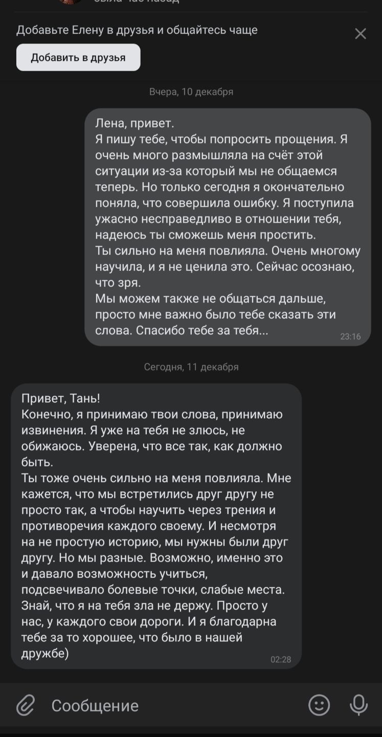 Я попросила прощения у Лены вчера ночью. И только после этого я смогла спокойно уснуть. Я благодарю судьбу за Лену, она подарила мне очень многое. Жаль, что я поняла это только спустя полгода после нашей ссоры.